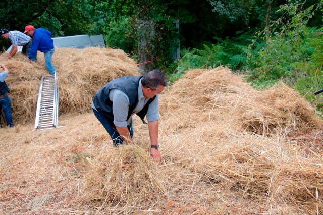 Finalmente, pouquiño a pouco coa palla que sae da malladora, faise o palleiro. No cumio, vaise botando a palla miuda que cae, para ir Por último, no curuto do palleiro colócase un mollo aberto, atado e ben apretado, retorcendo a palla por unha punta tipo vincallo. Isto para que non entre a auga no palleiro. A modo de adorno, nesta zona era costume colocar unhas flores propias da estación para facelo máis bonito.