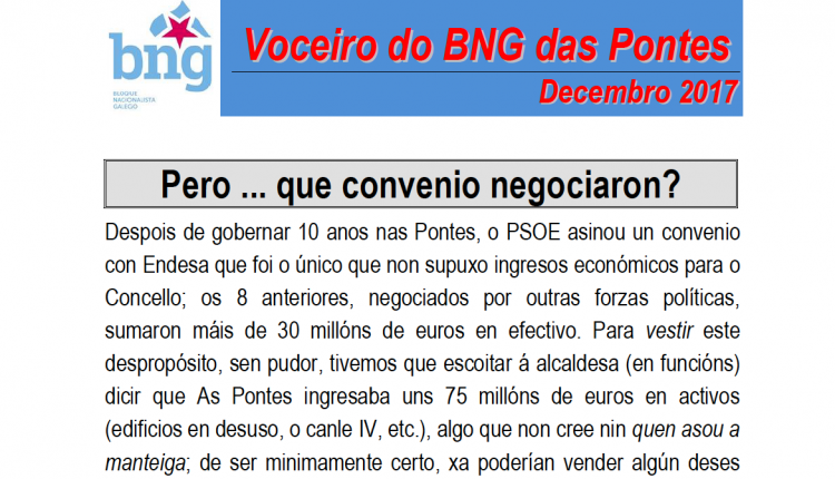 Despois de gobernar 10 anos nas Pontes, o PSOE asinou un convenio con Endesa que foi o único que non supuxo ingresos económicos para o Concello; os 8 anteriores, negociados por outras forzas políticas, sumaron máis de 30 millóns de euros en efectivo. Para vestir este despropósito, sen pudor, tivemos que escoitar á alcaldesa (en funcións) dicir que As Pontes ingresaba uns 75 millóns de euros en activos (edificios en desuso, o canle IV, etc.), algo que non cree nin quen asou a manteiga; de ser minimamente certo, xa poderían vender algún deses “activos” e así rebaixar os impostos. Pero quen vai comprar un túnel por máis de 15 millóns de euros? (ese foi o prezo no que o valoraron).