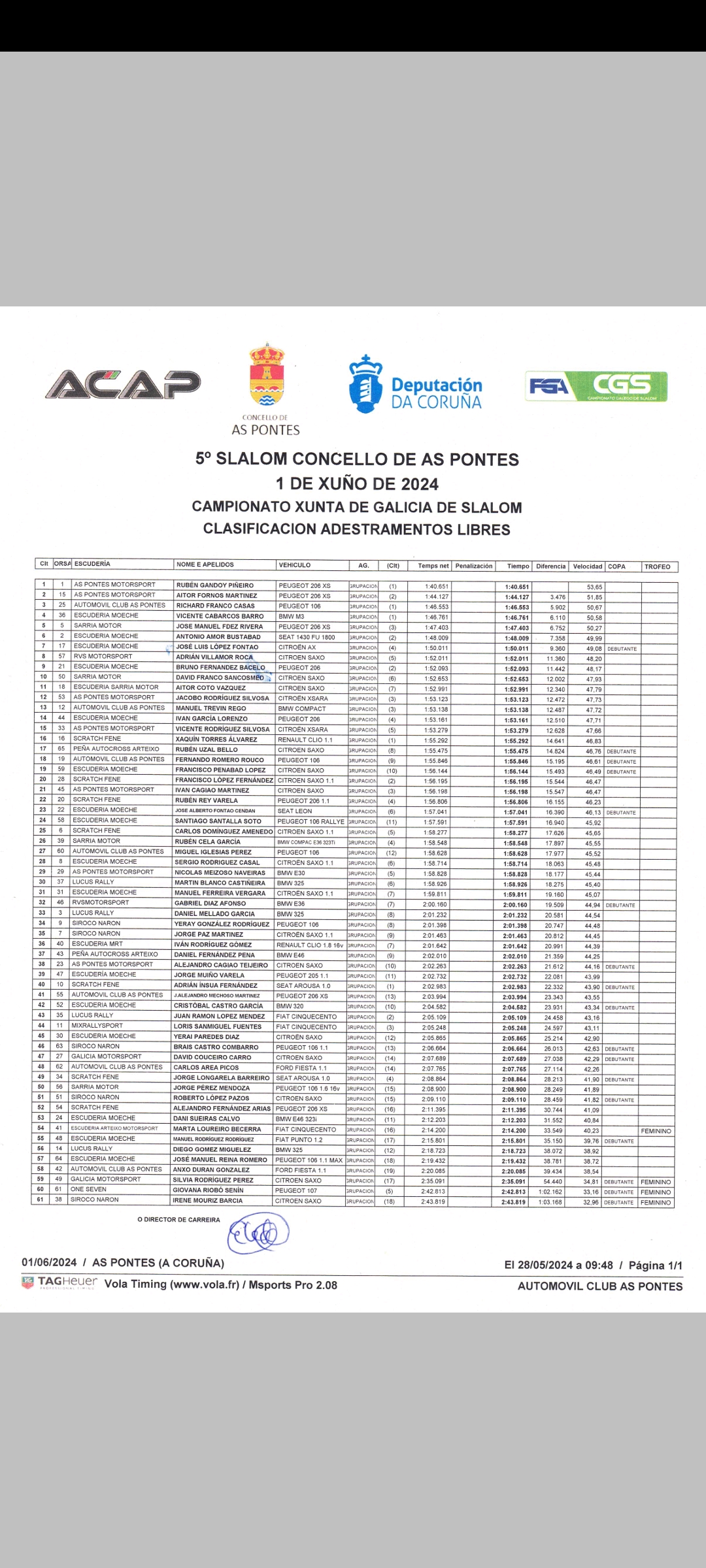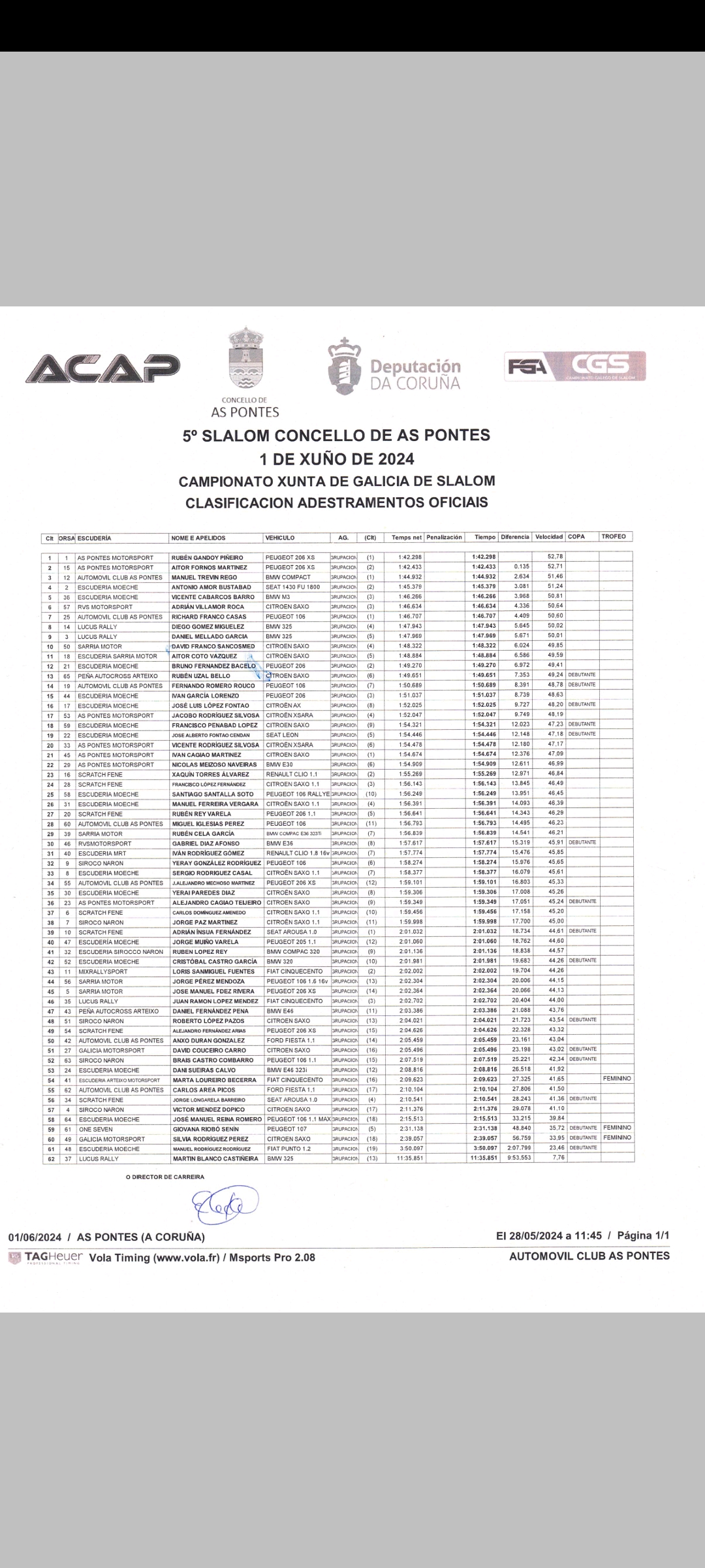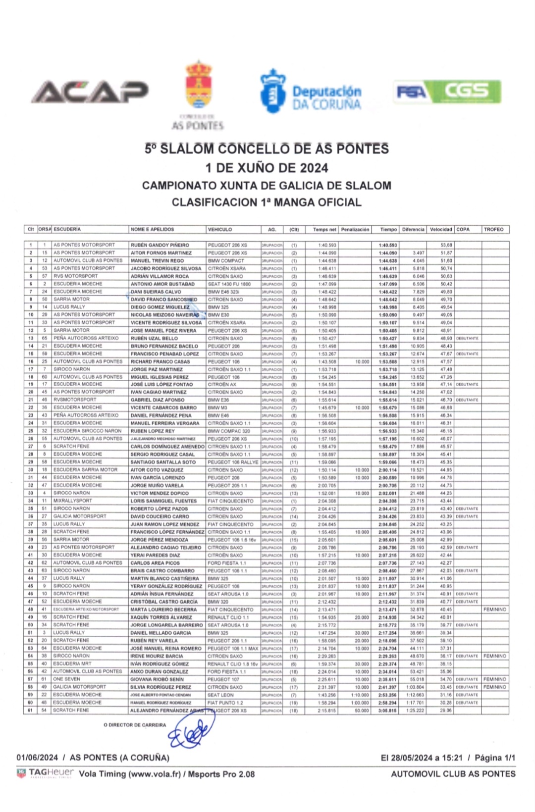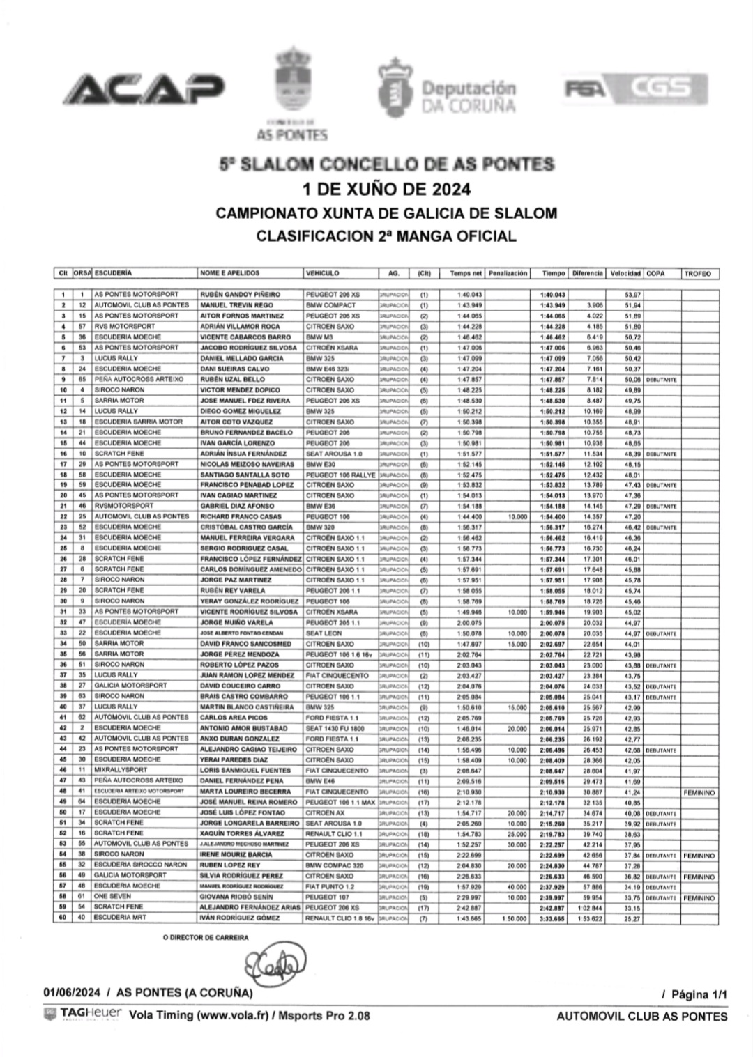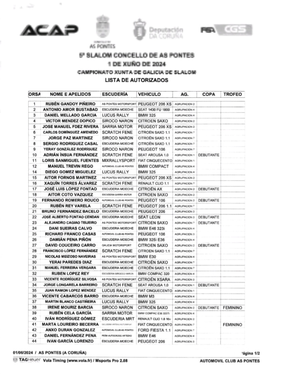 Este sábado a escudería Acap xuntaba unha morea de afeccionados ó redor do circuito de karts de As Pontes para desfrutar do V slalom vila de As Pontes nun día de moito vento que rematou co primeiro posto no peto de Rubén Gandoy no seu Peugeot 206 XS cun tempo de 1:40.043.